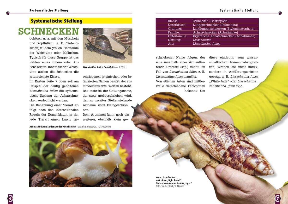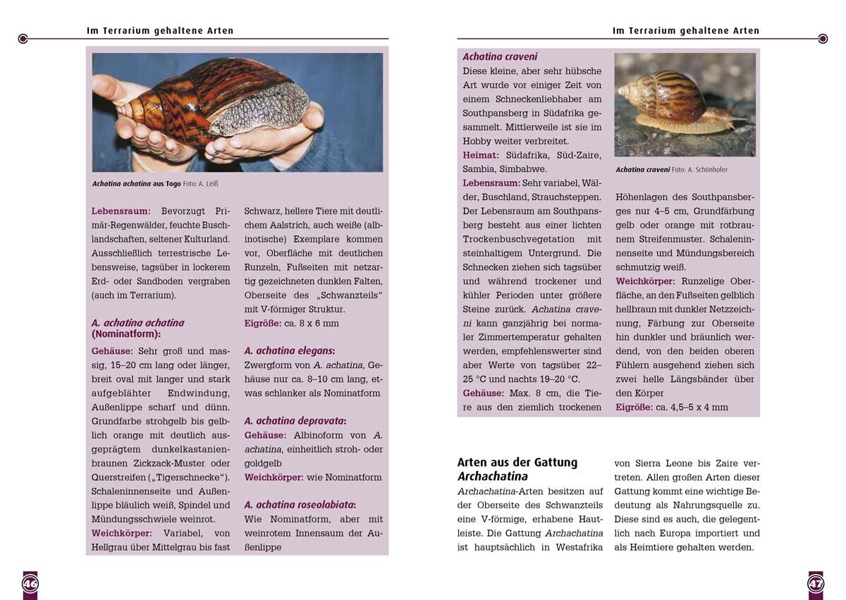 Alle wesentlichen Fragen werden behandelt: die Größe des Terrariums, seine Gestaltung, die technische Ausstattung, die geeignete Ernährung und die Krankheitsprävention. Viele Tipps aus der Erfahrung passionierter Züchter ergänzen diese Informationen. Sie werden auch erfahren, wie Sie die Fortpflanzung der Tiere fördern und die jungen Schnecken unter guten Bedingungen aufziehen können.