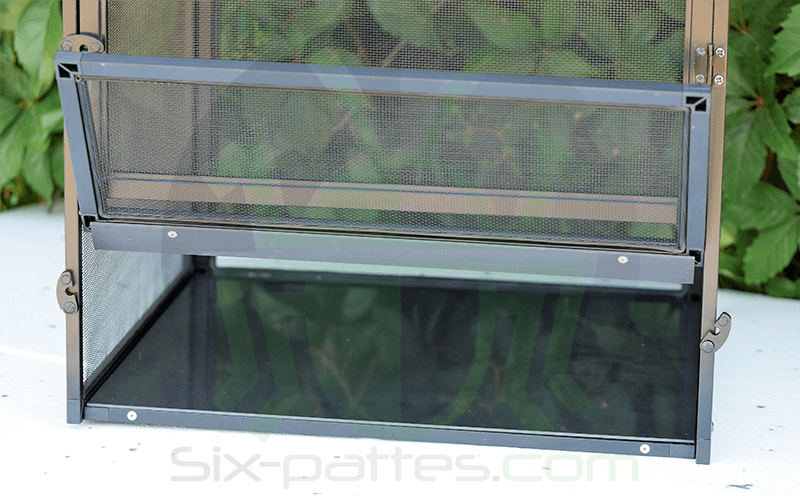 Schnelle Öffnung am Boden, sodass Sie das Terrarium reinigen können, ohne es vollständig öffnen zu müssen. Ideal zum Beispiel zum Sammeln von Stabheuschreckeneiern. Vorhandensein einer großen Vordertür zum einfachen Öffnen des Käfigs.