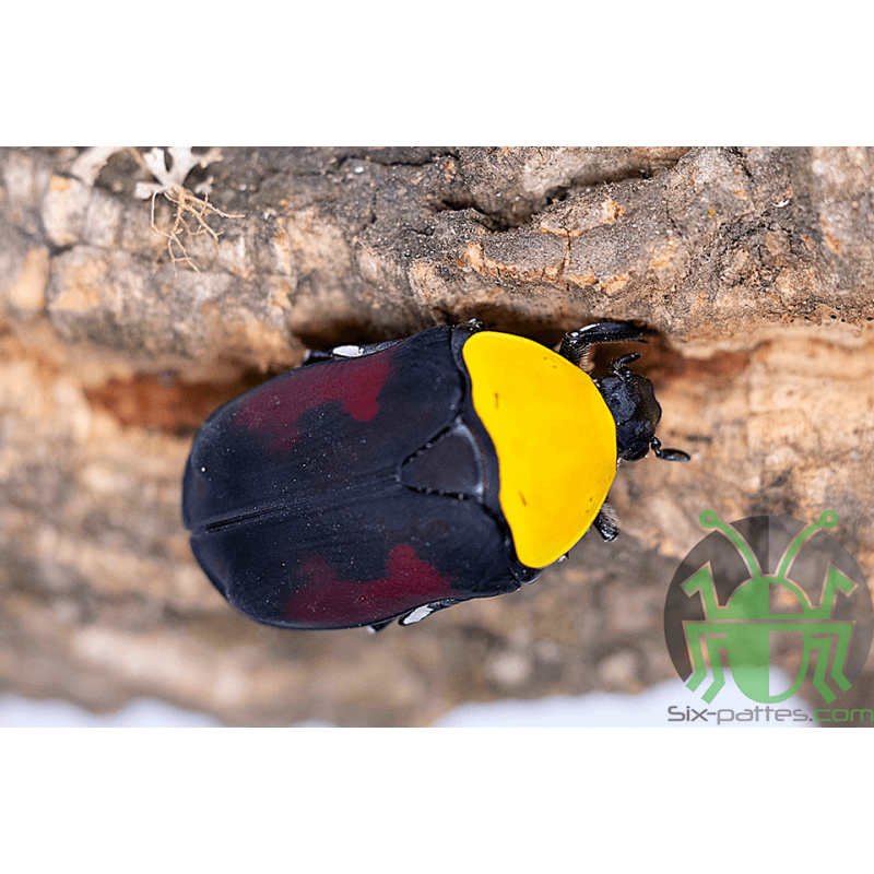 Pachnoda massajae is a species that appeared relatively recently in breeding. Very close morphologically to Pachnoda iskuulka, it measures on average about 2 cm in adulthood. It is distinguished by a bright yellow pronotum, contrasting with black elytra adorned with yellow to reddish spots, generally not very intense. The shape, size and coloration of the patterns can vary significantly from one individual to another, making each specimen unique. This species is native to eastern Africa, and is found in particular in Somaliland and Ethiopia.