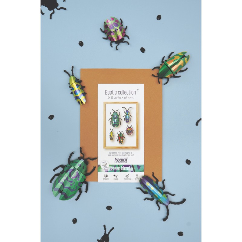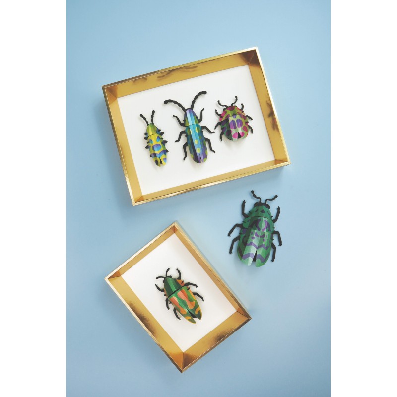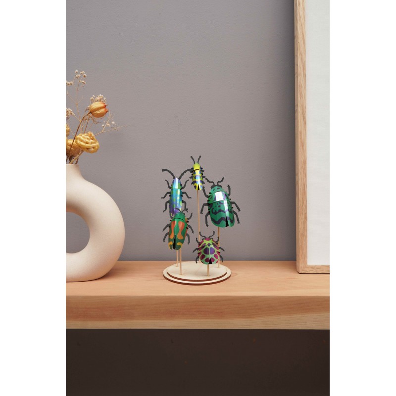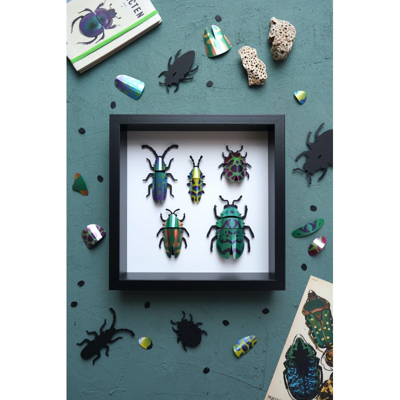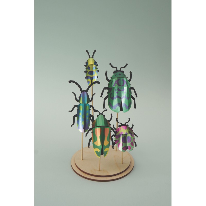 This complete kit allows you to assemble 5 magnificent 3D beetles in metallic colors , inspired by the most beautiful exotic scarabs. Each insect is built by simple fitting together, without any difficulty .