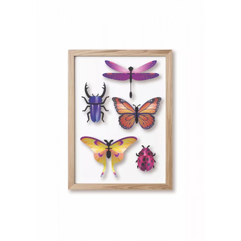 Assemble five colorful 3D paper insects, without any tools. A creative kit that allows you to easily create a small, ethical, and nature-friendly decorative collection.