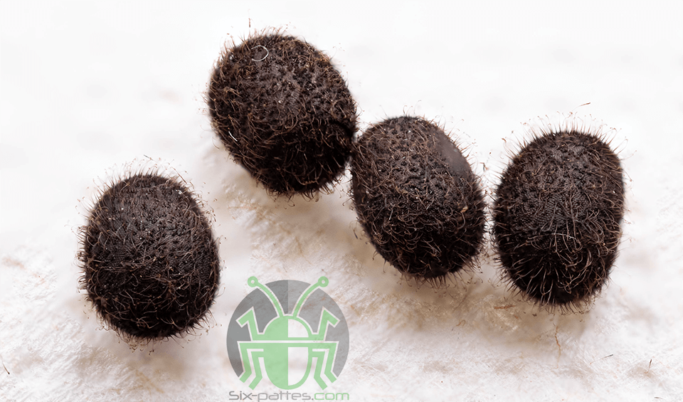 Laying method: The female Epidares nolimetangere drops her eggs on the ground, they are often grouped in the most humid areas. The eggs being hairy they tend to adhere easily to each other.