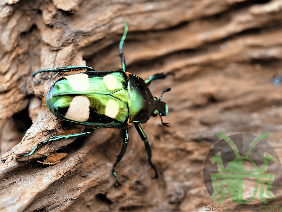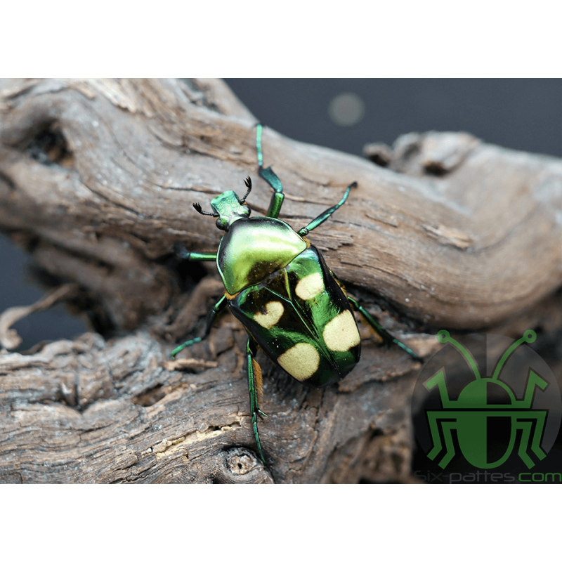 Très belle espèce de cétoine de couleur vert métallisé avec parfois quelques reflets cuivrés . Elle possède également deux tâches blanches sur chaque élytre qui varient en taille et en forme .