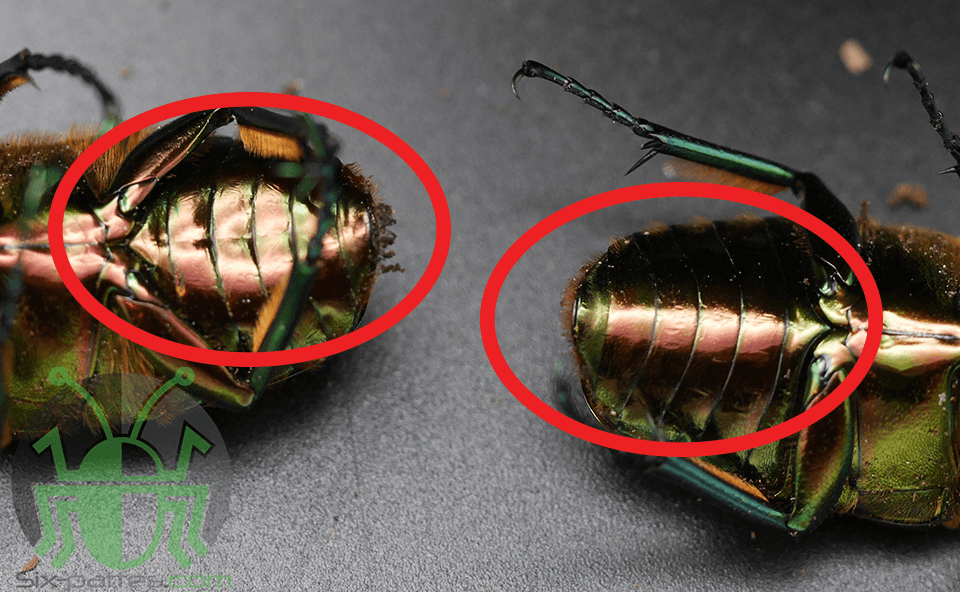 Sexage : Le mâle ne possède pas de corne comme la plupart des espèces de cette taille . Le sexage peut se faire en observant sous l'abdomen , le mâle possède un sillon contrairement à la femelle . Il possède également des tarses frontaux visiblement plus allongés et un pronotum plus courbé .