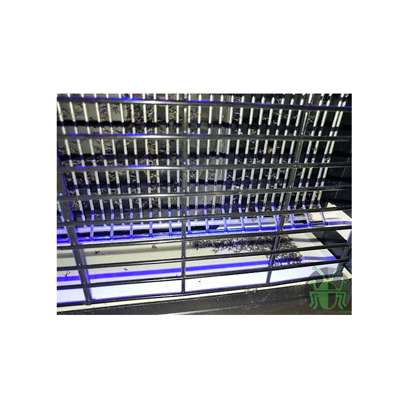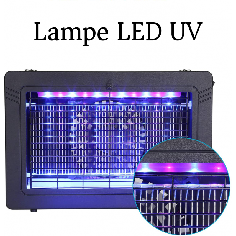 - Fonctionnement simple sans aucun produit chimique : les insectes volants sont attirés par la lumière bleue des tubes ultraviolets puis aspirés par le ventilateur . Ils sont ainsi foudroyés par électrocution avant de tomber dans le bac récupérateur